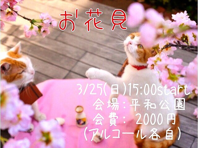 3/25(日)Candy Strapお花見 初めての方も大歓迎!! みんなでワイワイお花見しよー 時間→13:00〜16:00 会場→鶴舞公園 集合場所→12:50に鶴舞公園正面入口 ★途中参加もOKです!開催場所は当日お知らせします。 料金→2000円あるだけ食べ飲み放題! ★食べ物・飲み物持ち込み大歓迎! ★当日参加もOKですが、食べ物・飲み物準備のため、なるべく予約してね。 参加希望の方はお名前(HN可)と参加人数をcandy.strap.mockiy@gmail.comまで連絡してね!