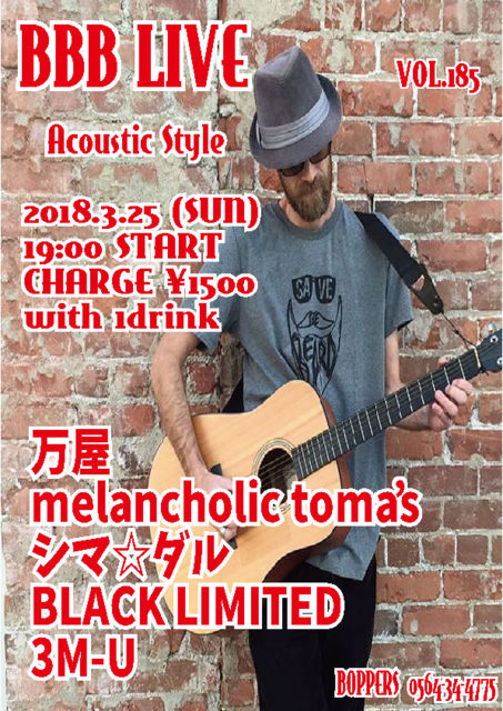 BBB LIVE 185 Acoustic Style 2018.3.25 (SUN) 19:00 START CHARGE \1500 with 1drink 万屋 melancholic toma's シマ☆ダル BLACK LIMITED 3M-U
