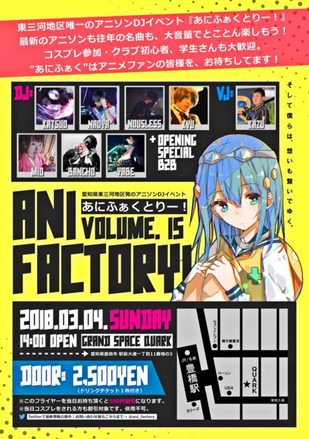 豊橋・豊川・三河の アニメ・アニソン好きのみなさん! 高音質 / 大音量のクラブQUARKで、 一緒にアニソンを楽しみませんか? クラブイベント初心者さんや、 コスプレイヤーさんも大歓迎! 併せ企画などもどしどしやっちゃって下さい 『あにふぁくとりー!』は皆さんを 心よりお待ちしてます! mixi参加表明でお得に入場しちゃおう! 3月4日は豊橋QUARKへ集合です! 『あにふぁくとりー!』Vol.15 ◆日時: 2018.03.04(日曜)14:00オープン ◆現場: 豊橋 GRAND SPACE QUARK ◆入場料: 2,500円(1ドリンク
