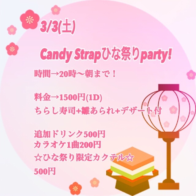 ☆3/3(土)☆ Candy Strapひな祭りparty! みんなでワイワイ食べて飲んで楽しんじゃおー╰(*´︶`*)╯ お友達作りやステキな出会いを見つけてね お一人様や初めての方もこの機会にぜひbarデビューしてみよう 時間→20時〜朝まで! 会場→Candy Strap 名古屋市中区栄5-6-4栄能楽ビル3F (052)228-8678 料金→1500円(1D+ちらし寿司+雛あられ+デザート付) 追加ドリンク 500円 カラオケ1曲200円 ☆ひな祭り限定カクテル☆ 500円