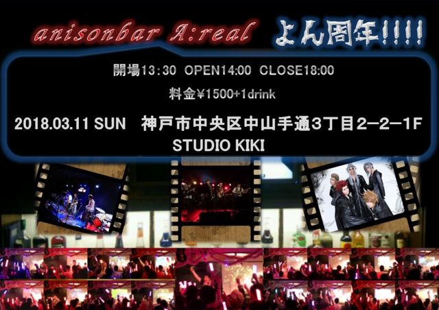 アニソンカジュアルバー アリエルも皆様のおかげで4周年♪ 今年もAnniversary Partyを開催させていただく運びとなりましたが、今回はいつもと場所が違うのです! 昨年11月にライブイベントで使わせて頂いたSTUDIO KIKI でヤります♪ アリエルからは徒歩5分くらいですね。 トアロード沿いにあります 兵庫県神戸市中央区中山手通3丁目2−2−1F 2018年03月01日で4周年を迎えますアニソンカジュアルバー アリエル! なんだかんだで遊んでくれるオタク紳士淑女に大大感謝ですm(_ _)m そして周年イベでは恒例になりますアニソンバンド