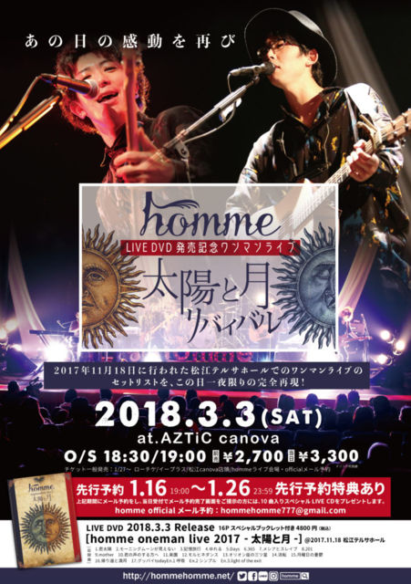 2017ǯ11·î18Æü¤Ë¹Ô¤ï¤ì¡¢ÂçÀ®¸ù¤ÇËë¤òÊĤ¸¤¿homme½é¤Î¥Û¡¼¥ë¥ï¥ó¥Þ¥ó¥é¥¤¥Ö¤Î±ÇÁü²½¤òµÇ°¤·¡¢È¯Ç䯱Æü¤Î2018ǯ3·î3Æü(ÅÚ)¤ËLIVE DVDȯÇäµÇ°¥¹¥Ú¥·¥ã¥ë¥ï¥ó¥Þ¥ó¥é¥¤¥Ö¤ò³«ºÅ¤¹¤ë¤³¤È¤¬·èÄê