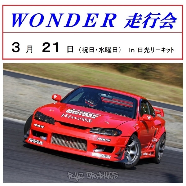 3月 21日 (祝日・水曜日) 日光サーキット WONDER走行会 を開催いたします!!! エンジョイ派 の 走行会クラス 腕試し の ドリコンクラス 初級、中級、中上級、上級,各クラス分け設定あり ※今年度より新たに中上級クラスを増設しました ドリコン入賞者には,各クラスごとにトロフィー(1位〜3位)と賞金等が贈呈されます!!! (賞金の金額は各クラスエントリー台数によって変動します) ★走行本数★ 走行会形式ですので、走行時間は 10分 × 1本、 12分 × 3本、