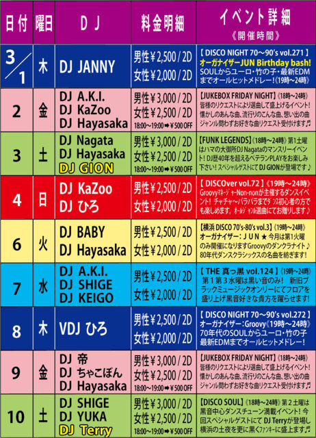【ブラックミュージック好きな方お待ちかね!】 2018年3月も!第1&第3水曜は♪ 黒い音のみでフロアを盛り上げ続ける【THE 真っ黒】 他日のDISCO Groovyではなかなか聴くことのできないレアな FUNK&SOUL MUSICを是非ご堪能ください☆ 【DJ's】 A.K.I. / SHIGE / KEIGO 【音楽】 BLACK ALL MIX (Soul、Funk、Dance Classics、R&B、Hip-Hop、New Jack Swing、etc...) 【開催時間】 19:00〜24:00 【料金】 男性:¥2,500 / 2Drinks 女性:¥2,000 / 2Drinks