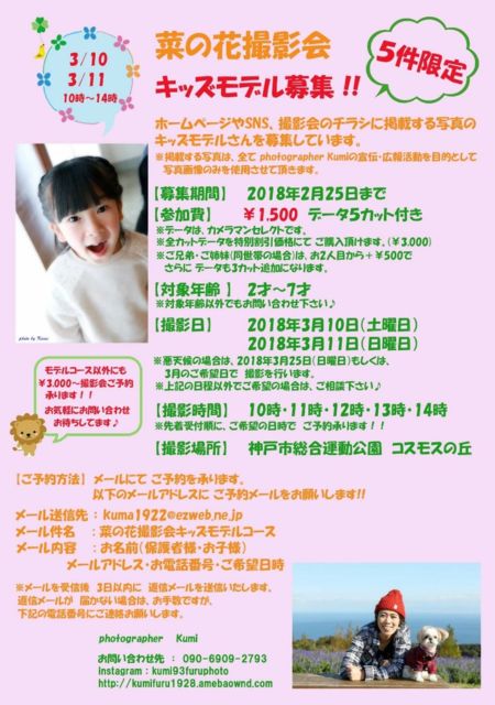 2018年3月10日11日 10時・11時・12時・13時・14時枠で 限定5件 神戸市総合運動公園 コスモスの丘にて 菜の花撮影 キッズモデル撮影会を開催します!! photographer KumiのホームページやSNS、撮影会のチラシに掲載する写真のキッズモデルさんを募集しています。 参加費¥1,500 データ5カット付き ※データは、カメラマンセレクトです。 キッズモデル撮影は、 2018年2月25日まで募集しています。 キッズモデル撮影以外にも 通常の菜の花撮影会もご予約承ります。 お子様、ファミリー、わんちゃんも撮影頂けます! ¥3,000〜 ご予約・お問い合わせ