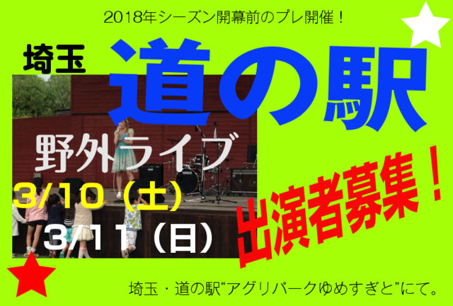 2018年シーズン開幕前のプレ開催! 【埼玉・杉戸「道の駅」会場/出演者募集!】 インディーズアーティスト活動支援ライヴイベント「野外ライヴシリーズ」 『SUGI ROCK FESTIVAL ・SUGITO SOUND FES.』 出演者募集のお知らせ 埼玉県杉戸町にある「大人気・道の駅」併設の 「野外大ステージ」での野外ライヴイベントです。 「道の駅『アグリパーク・ゆめすぎと』(埼玉県杉戸町)」 「道の駅」併設の大きな「野外ステージ」でパフォーマンスしてみませんか? ファンの方々と一緒に青空の下、熱いライブで盛