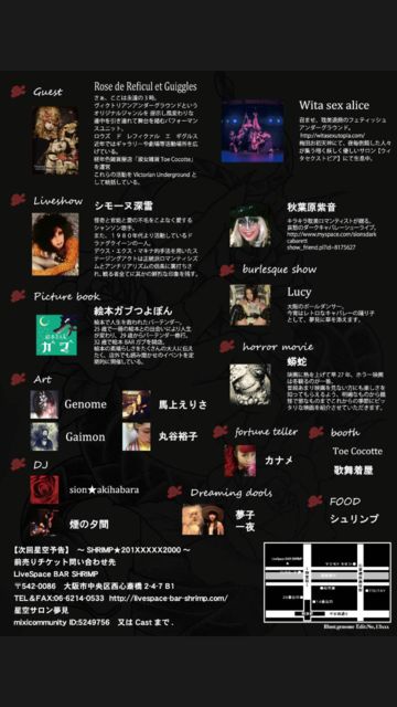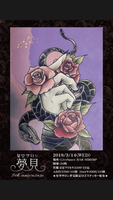 星空サロン 夢見 8周年記念 2018 03 14 wed ライブサロン バー シュリンプ 大阪市西心斎橋 0662140533 http://livespace-bar-shrimp.com/ 出演: 秋葉原紫音/シモーヌ深雪/ロウズ ド レフィクァル エ ギグルス/ウィタセクスアリス/うわばみ/けむり/ガブつよぽん ほか 20:00〜