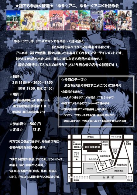 ´ÉÍý¼ÔÍÍ ¥¹¥Ú¡¼¥¹¤ò¤ª¼Ú¤ê¤·¤Þ¤¹¡£ ¡Ö¤æ¤ë¡ù¥¢¥Ë¡×¤Ï¡¢¥¢¥Ë¥á¤ä¥Þ¥ó¥¬¤ò¤æ¤ë¡Á¤¯¸ì¤ê¹ç¤¤¡¢¼«Ê¬¤Î¹¥¤¤Ê¥Ñ¥é¥À¥¤¥¹¤ò¶¦Í¤¹¤ë²ñ¤Ç¤¹¡£ ¥¢¥Ë¥á¤Ï¡¢¾Ð¤¤¤ä´¶Æ°¡¢ÍÍ¡¹¤Ê³Ú¤·¤µ¤òÍ¿¤¨¤Æ¤¯¤ì¤ë¥¨¥ó¥¿¡¼¥Æ¥¤¥ó¥á¥ó¥È¤Ç¤¹¡£ ÃΤé¤Ê¤¤ºîÉʤȽвñ¤Ã¤¿¤ê¡¢¿·¤·¤¤³Ú¤·¤ßÊý¤âȯ¸«½ÐÍè¤ë¤«¤â¢ö ¡ÖºÇ¶á¤Îή¹Ô¤ê¤Ã¤Æ¤É¤ó¤Ê¤Î¤À¤í¤¦¡©¡×¤È¤¤¤¦½é¿´¼Ô¤ÎÊý¤âÂç´¿·Þ¤Ç¤¹¡ª ¨¬¨¬¨¬¨¬¨¬¨¬¨¬¨¬¨¬ Æü»þ¡§3·î15Æü(ÌÚ)20:00¡Á21:50 ¡¡¡¡¡¡ (³«¾ì 19:50¡¡Å±¼ý 21:50) ¾ì½ê¡§Åìµþ·Ý½Ñ·à¾ì 6F ²ñµÄ¥ë¡¼¥à ¡¡¡¡¡¡ÅìµþÅÔ ËÅç¶èÀ¾ÃÓÂÞ1-8-1 ¡¡¡¡¡¡ÃÓÂÞ±Ø À¾