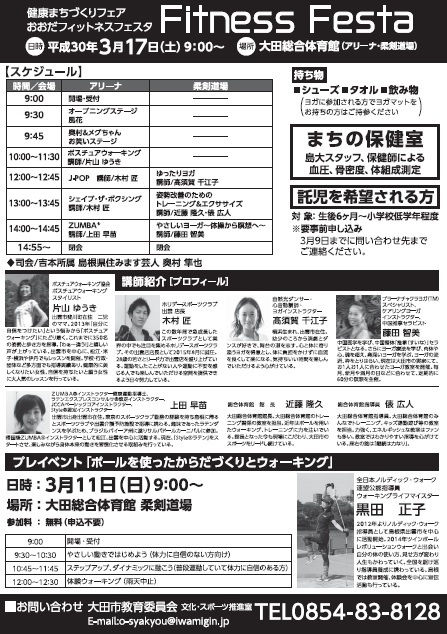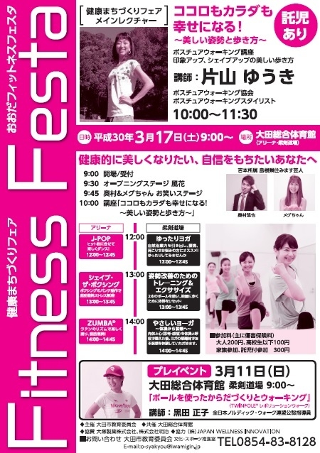 奥村隼也さん、メグちゃんがイヴェントに出演いたします。 『健康まちづくりフェア おおだフィットネスフェスタ』 【日時】 2018年3月17日(日) 9時〜15時 【会場】 大田総合体育館 島根県大田市大田町大田ロ1451番地 http://sougoutaiikukan.jp/ 【出演】 メグちゃん 奥村隼也 他 お笑いステージが9時45分〜10時に行われます。