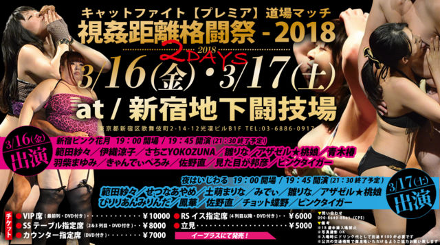 「帰ってきた!キャットファイト道場マッチ」 視姦距離格闘祭-2018 at/新宿地下闘技場(03-6886-0917) 東京都新宿区歌舞伎町2-14-12光凜ビルB1F ※写真撮影OK ◎2018年3月16日(金) 新宿ピンク花月 19:00開場/19:45開演(21:30終了予定) 【出演】範田紗々/伊織涼子/さちこYOKOZUNA/雛りな/アザゼル★桃娘/青木椿/羽柴まゆみ/きゃんでぃぺろみ/佐野直/見た目が邦彦/ピンクタイガー ◎2018年3月17日(土) 夜はいじわる 19:00開場/19:45開演(21:30終了予定) 【出演】範田紗々/せつなあやめ/土萌まりな/みでぃ/