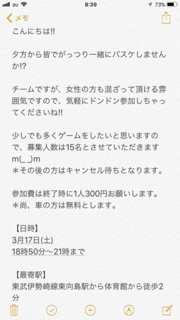 皆さんこんにちは。 ナギと申します。 今週の土曜日に体育館を確保できたので募集を致します。 女性・初心者の方も歓迎です。 そのため、ガッチガチのバスケをしたい方はご遠慮下さい。 (もちろん経験者の方も歓迎ですが、女性や初心者の方への配慮もよろしくお願いします。) 参加される場合は参加表明とともに、性別も一緒に記載をお願いいたします。 【募集要項】 日時:3月17日(土曜)9:00〜11:30 場所:港区勤労福祉会館 http://www.city.minato.tokyo.jp/shisetsu/shokokaikan/kinrofukushi/01.html 最寄: