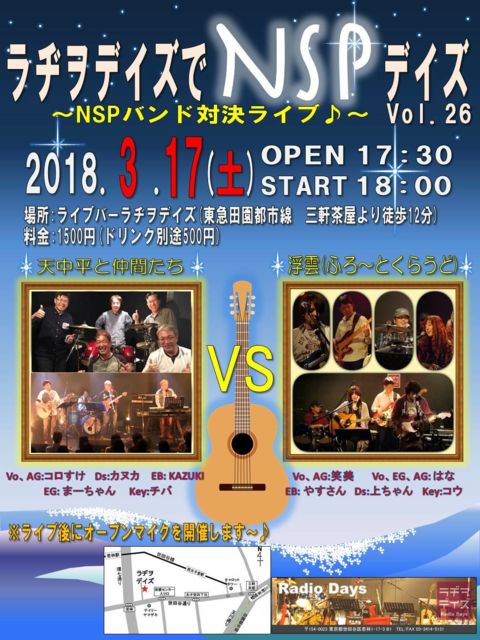 NSPのコピーユニット「天中平と仲間たち」のライブのお知らせです。 昨年12月9日のライブへは多くのお客さまにお越しいただき、本当にありがとうございました。 この日のライブは私 KAZUKIが家庭の事情で出演できず、ベースなしの4人編成でのライブとなりました。 メンバー間では秋からずっと練習してきた5人の編成でもう一度ライブが出来ないかと検討して参りましたが、この度、NSPコピーバンドの「浮雲(ふろ〜とくらうど)」さんとのジョイント・ライブで、何とそのリベンジが実現することになりました! 今回のライブは、ふたつのバンドス