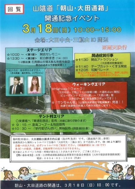 奥村隼也さん、メグちゃんがイヴェントに出演いたします。 『山陰道「朝山・大田道路」開通記念イベント』 【日時】 2018年3月18日(日) 10時〜15時 【会場】 大田中央・三瓶山IC周辺 【総合司会】 奥村隼也 メグちゃん http://www.ginzan-wm.jp/wp-content/uploads/20180227182644345.pdf