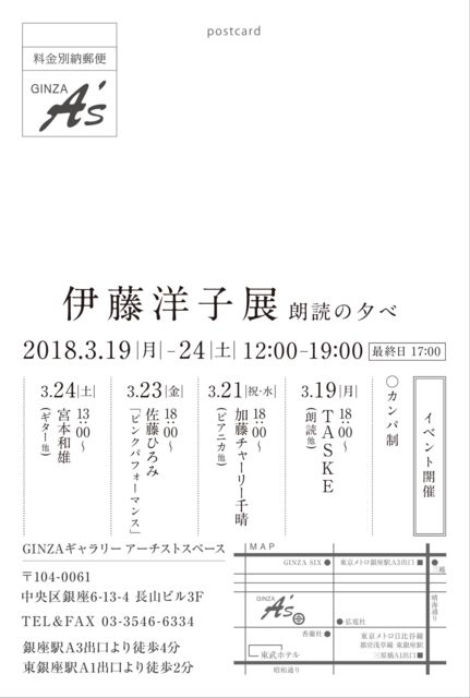 会期中 毎日 18:00 〜 (最終日だけは 13:00 〜) イベント (パフォーマンス) がございます。続々、豪華ゲスト。そして、もちろん、 作家本人 (伊藤 洋子) による朗読も。 お客様がカラミに来るのも大歓迎です。 伊藤 洋子 も 皆さんにカラミにゆくかも !! 投げ銭、大歓迎です !! 壁面も、伊藤 洋子 の美術作品です。 よ、う、す、る、に。 詩人としての 伊藤 洋子。 朗読パフォーマーとしての 伊藤 洋子。 美術作家としての 伊藤 洋子。 これら全ての側面が 一気に堪能できてしまう、 という ステキ企画でございます。