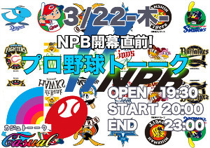 3/22-thu- カジュトーーク #21 「プロ野球トーーク」 OPEN 19:30 START 20:00 END 23:00 入場無料