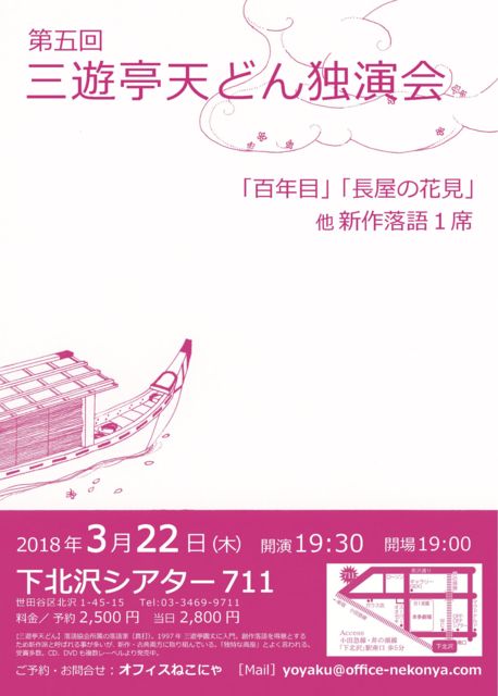 3月22日(木)19時30分開演 <三遊亭天どん独演会> 「百年目」「長屋の花見」他、新作一席 料金:予約2,500円 当日2,800円(自由席) 会場:下北沢シアター711 http://www.honda-geki.com/map.html 予約・問合わせ:オフィスねこにゃ yoyaku@office-nekonya.com お世話になっております。 もう明後日、火曜日からと迫ってしまいました、オフィスねこにゃ3月連続公演。 3日目は、天どん師匠によるお花見落語会。 この忙しい時期に、と反省しておりますが、ぜひいらしてください。 皆さまのご予約お待ちしております! オフィ