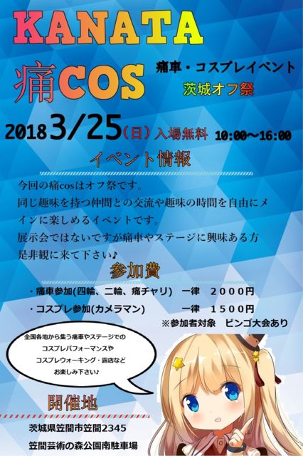 2018年3/25アニメ痛車コスプレサブカルイベント KANATA痛cos茨城オフ祭開催致します! 会場は茨城県笠間市笠間芸術の森公園の南駐車場にて開催♪ 今回【みんなで楽しむ】をメインに開催するイベントになります。みんなで盛り上げるオフな祭りです。 一般の方の当日見学入場無料大歓迎です♪ 普段あまり見る事のない痛車やコスプレパフォーマンスユニットによる野外ステージショー、露店など楽しんで行って下さい♪会場の園内では公園もあり子供連れてお楽しみ頂けます♪ コスプレイヤーさんはステージでコスプレウォーキングもやります♪ウォーキ