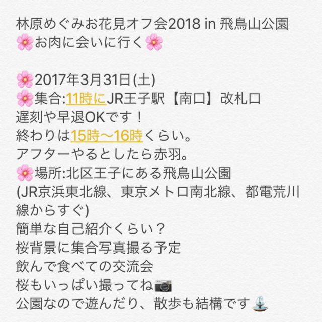コミュ管理人様イベント立ち上げ失礼しますm(_ _)m 今年も決定! 林原めぐみさん繋がりお花見オフ会2018 〜お肉に会いに行く〜 ※めぐさん本人はいません 3/30現在参加者18名以上 3月31日(土)11時〜東京 飛鳥山公園 最寄り駅:王子駅下車すぐ 二次会未定 遅刻早退OK 当日参加OK で す が 場所取りの為、前日までの参加表明ご協力お願いしますm(_ _)m 【画像に詳細あり。必ず御一読くださいね💕】 ※諸事情により画像添付になります 私主催は月さんのめぐオフによくいる人です