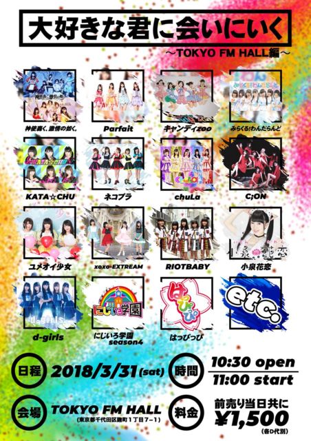 ¡ÖÂç¹¥¤¤Ê·¯¤Ë²ñ¤¤¤Ë¤¤¤¯¡ÁTOKYO FM HALLÊÔ¡Á¡× Æü»þ¡§03/31(ÅÚ) ³«¾ì10:30 / ³«±é11:00 ²ñ¾ì¡§ÅìµþFM¥Û¡¼¥ë ÎÁ¶â¡§1,500±ß¡Ê1DÊÌ¡Ë ½Ð±é¡§¿À»È¹ì¤¯¡¢·ã¾ð¤ÎÇ¡¤¯¡£ / Parfait / ¥¥ã¥ó¥Ç¥£zoo / ¤ß¤é¤¯¤ë¡ª¤ï¤ó¤À¤é¤ó¤É / KATA¡ùCHU / ¥Í¥³¥×¥é / chuLa / ¥¨¥â¥Ã¥× / C;ON / ¥æ¥á¥ª¥¤¾¯½÷ / xoxo(Kiss&Hug) EXTREAM / RIOTBABY / ¾®Àô²ÖÎø / d-girls / ¤Ë¤¸¤¤¤í³Ø±àseason4 / ¤Ï¤Ã¤Ô¤Ã¤Ô /