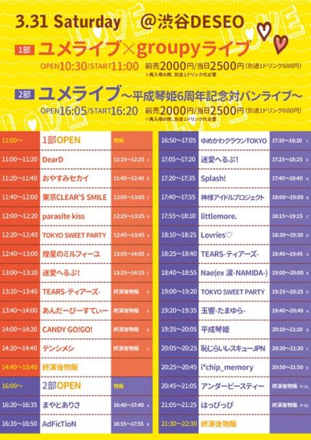 ¡Ö¥æ¥á¥é¥¤¥Ö¡×¡ÁÊ¿À®¶×ɱ6¼þǯµÇ°ÂХХó¥é¥¤¥Ö¡Á Æü»þ¡§03/31(ÅÚ) ³«¾ì16:15 / ³«±é16:45 ²ñ¾ì¡§½ÂëDESEO ÎÁ¶â¡§Á°Çä2,000±ß / ÅöÆü2,500±ß¡Ê1DÊ̡ˢ¨ºÆÆþ¾ì²Ä(Í×1D) ½Ð±é¡§¤Ï¤Ã¤Ô¤Ã¤Ô/¥È¥¹¥Ñ¥ê/¥¢¥ó¥Ó¥¹/¥Æ¥£¥¢¡¼¥º/Splash!/¤æ¤á¤«¤ï¥¯¥é¥¦¥ó/Ãѥ쥹/̰¦/littlemore./AdFicTioN/Lovries♡/¡Ä