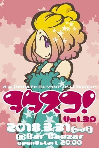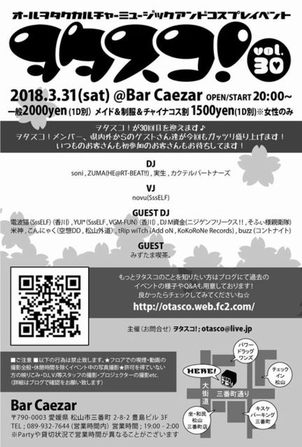 愛媛のアニソン系DJイベントヲタスコ!が30回目を迎えます♪ ヲタスコ!メンバーと県内外からのゲストさん達が今回もガッツリ盛り上げます! 女性のみ、ジャンル限定のコスプレ割引アリ! いつものお客さんも初参加のお客さんもお待ちしてます! http://otasco.blog.fc2.com/blog-entry-159.html ヲタスコ!vol.30】 ◆2018.3.31 (土) OPEN/START 20:00 ◆ticket:一般/\2000(1d別) メイド&制服&チャイナコス割/\1500(1d別)※女性のみ ◆会場:BarCaezar (松山市三番町2-8-2 豊島ビル3F) 出演 ◆DJ soni / ZUMA(HE