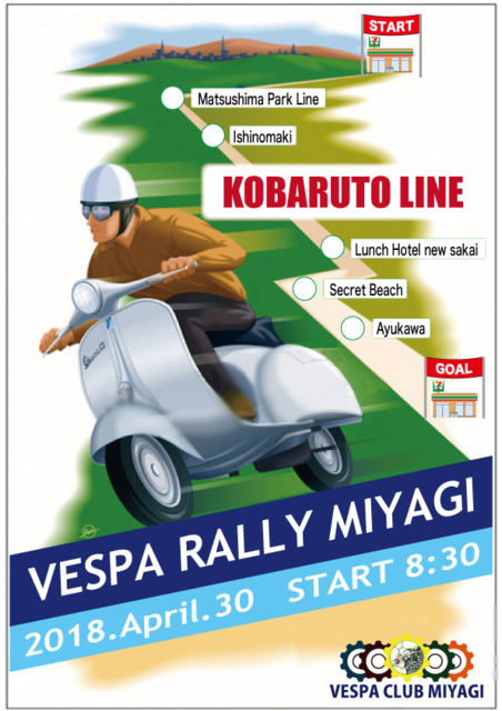 「2018 VESPA RALLY MIYAGI」を開催致します。 日本百選道にも選ばれたツーリングの聖地「牡鹿半島コバルトライン」 をめざしラリーイベントを行います。 開催日時・・・4月30日 月曜日 (振替休日) 集合場所 ・・・セブンイレブン宮城松島店        〒981-0213 宮城県宮城郡松島町松島道珍浜38−77        向かえにガソリンスタンドがありますので満タンにして御集合下さい        集合時間 ・・・8時00分 8時30分スタート     (解散3時30分予定) 行き先・・・・牡鹿半島コバルトライン