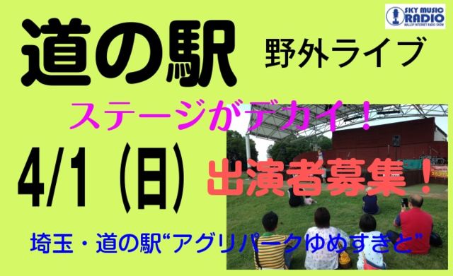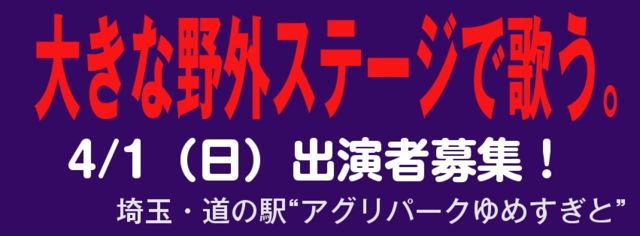 【埼玉・杉戸「道の駅」会場/出演者募集!】 インディーズアーティスト活動支援ライヴイベント「野外ライヴシリーズ」 『SUGI ROCK FESTIVAL ・SUGITO SOUND FES.』  出演者募集のお知らせ 埼玉県杉戸町にある「大人気・道の駅」併設の 「野外大ステージ」での野外ライヴイベントです。 「道の駅『アグリパーク・ゆめすぎと』(埼玉県杉戸町)」 「道の駅」併設の大きな「野外ステージ」でパフォーマンスしてみませんか? ファンの方々と一緒に青空の下、熱いライブで盛り上がりましょう! 「道の駅併設の野外ステ