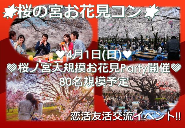 【4月1(日)お昼の大規模お花見Party開催】 場所取り必須の人気のお花見人気スポットで、大規模お花見に参加しませんかスタッフが気合いの前日から場所取りに走ります(๑>◡<๑)笑 お花見を通して多くの人と交流しましょう♪───O(≧∇≦)O────♪ 恋活・友活イベント 【日時】 4月1日(日) 受付開始 12時30〜 スタート13:00〜(2時間半制) 「飲み放題+ビュッフェ形式の9品付」