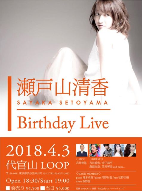1.日時 2018/4/11(水) 開場 18:30,開演 19:00 2.会場 代官山LOOP 〒150-0035 東京都渋谷区鉢山町13-12 B1 http://www.live-loop.com/ ・東急TRANSSES DAYKANYAMA LOOP LINE https://www.tokyubus.co.jp/route/daikanyama/ 渋谷駅南口 バス停35番 ・・伊太利屋本社下車 徒歩5分 ・・西郷橋下車 直ぐ(循環バスなのでこちらの方が時間がかかります) 3.チケット(ドリンク代別) 前売り \4,500 当日 \5,000