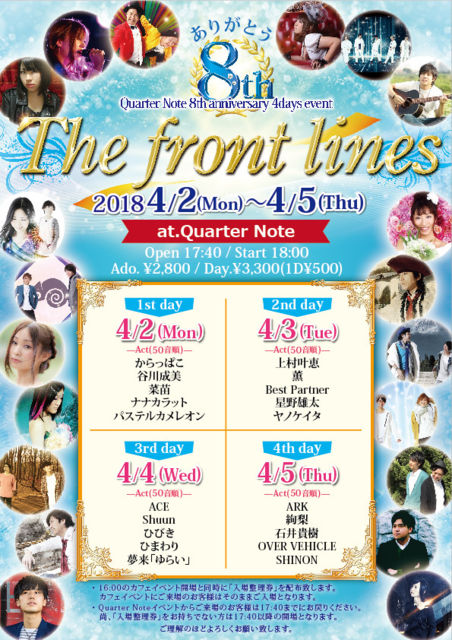 2018/04/03 (火)新大久保QuarterNote Quarter Note 8th anniversary open:17:40 / start: 18:00 出演: 上村叶恵 ・薫 ・Best Partner ・星野雄太 ・ヤノケイタ 入場料: 前売り¥2,800、当日¥3,300(1D別) 出演時間 20:20-20:55 ※入場整理券が16:00に配られるそうですが、open以降であればそのままお入りいただけます グランドピアノでお届けします アクセス http://quarter-note.com/access.html JR新大久保駅より 徒歩2分 ご予約はHPからどうぞ⇒http://uemura-kanae.com/liveinfo/