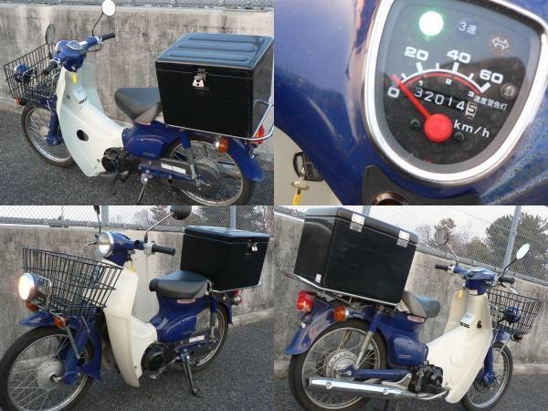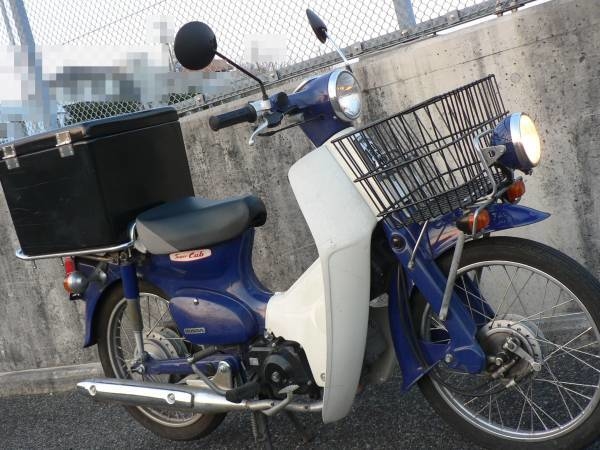 ・メーカー名: ホンダ ・車名: プレスカブ 50STD インジェクション ・車体番号:AA01-180**** ・2st/4st: 4st ・排気量: 50 ・色: アオ ・自走: 可能 ・走行距離: 32014km ・車検/自賠責の有無: 無し ・事故歴: 無し もちろんエンジンの異音や目立つオイル漏れはありません。調子良いです。 ・キズや不具合の有無: フロントレッグ 真ん中・左下にひび割れあり。ガタツキなどはありません。 タイヤはF 1・R 5程です。 ・カスタム箇所や装備: 前カゴ・カゴ前にヘッドライト。リアボックスはありますが、鍵