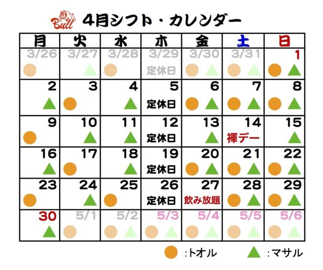 早くも4月突入しましたね〜 4月予定 毎週の平日(月・火・水)9時までお得な早割 2000円 ショットコース 3杯+お通し ボトルキープコース 割物フリー+お通し ボトルキープ千円引き 4月14日第2土曜日恒例の褌デー17時より21時まで褌オンリー 21時以降ミックス営業 4月27日4金曜日焼酎・泡盛、ソフトドリンク2千円飲み放題です。 因みに食べ物持ち込み自由ですよ。 季節の変わり目体調崩さないよう楽しみましょう(^^w