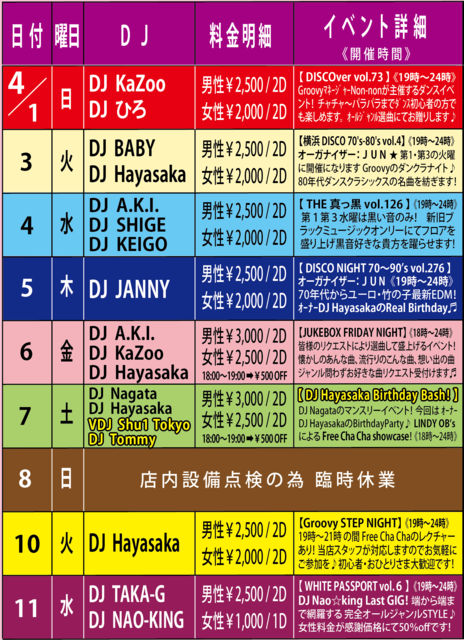 ★第1&第3火曜開催! DISCO Groovyのダンクラナイト★ DISCO好きなあなたなら 必ず聴いたこと踊ったことのある 70年代〜80年代ダンスクラシックスの名曲を【DJ BABY&DJ Hayasaka】のプレイにて紡ぎます♪ 【オーガナイザー】 JUN 【音楽】 70年代〜80年代のDance Classics(ダンクラ) 【開催時間】 19:00〜24:00 【料金】 男性:¥2,500 / 2Drinks 女性:¥2,000 / 2Drinks