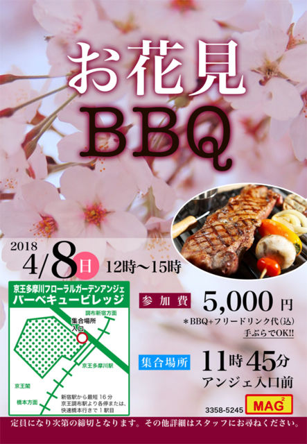 桜開花予報も発表になり、ようやく春間近になってきましたね! さて、京王多摩川フローラルガーデン・アンジェ・バーベキュービレッジ にて、お花見&BBQをおこないます。 暖かい春の日差しの中で横目に桜を見ながら、みんなでバーベキューを楽しもう! 植物園の中にチェリーガーデンもあるよ〜ん。 ぜひぜひ、お誘い合わせの上ご参加くださーい。よろしくお願いします。 ●開催日時 2018年4月8日(日曜(12時〜15時)) ●場所は、京王多摩川・京王フローラルガーデン・アンジェ・バーベキュービレッジ [ アクセス:京王調布駅より