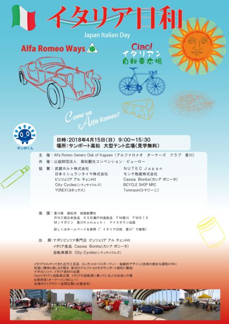 管理人様、コミュの皆様、イベント告知させて頂きます。 コミュニティに参加していますmarushioと申します。 アルファロメオ・オーナー様同士のコミュニケーション、情報交換を目的とした手作りオーナーズミーティング”Alfa Romeo Ways“を香川県高松市のサンポート高松で開催します。お話をするも良し、観光・散策をするも良し、さぬきうどんを食べに来るついででも良し。ドライブシーズンが到来する春。お気軽に参加してください。 Alfa Romeo Ways (第9回) ○主催 Alfa Romeo Owners Club of Kagawa ○日時
