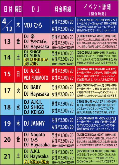 4·î¤âËè½µÌÚÍËÆü¤Ï¡ª ¤ª¤Ê¤¸¤ß¥æ¡¼¥í¥Ó¡¼¥È¿¤á¤Î¥Ç¥£¥¹¥³¥Ê¥¤¥È¢ö 70ǯÂå¤ÎSOUL¥ß¥å¡¼¥¸¥Ã¥¯¤«¤éºÇ¿·¤ÎEDM¤Þ¤Ç¥ª¡¼¥ë¥Ò¥Ã¥È¥á¥É¥ì¡¼¡ª Music Video¤ò¤Õ¤ó¤À¤ó¤Ë¿¥¤ê¸ò¤¼¤Ê¤¬¤éÍÙ¤ì¤ë¶ÊÀ¹¤êÂô»³¤Ç¤ªÂ£¤ê¤·¤Þ¤¹♬ ¡Ú¥ª¡¼¥¬¥Ê¥¤¥¶¡¼¡Û£Ê£Õ£Î ¡Ú£Ä£Ê¡ÛJANNY¡ÊMAHARAJA ROPPONGI¡Ë ¡Ú²»³Ú¡ÛALL GENRE ¡ÊSOUL¡¢Ãݤλҡ¢¥À¥ó¥¯¥é¡¢EURO¡¢HI-NRG¡¢TECHNO¡¢R&B¡¢EDM¡¢etc¡Ä¡Ë ¡Ú³«ºÅ»þ´Ö¡Û 19:00¡Á24:00 ¡ÚÎÁ¶â¡Û ÃËÀ¡§¡ï2,500 / 2Drinks ½÷À¡§¡ï2,000 / 2Drinks