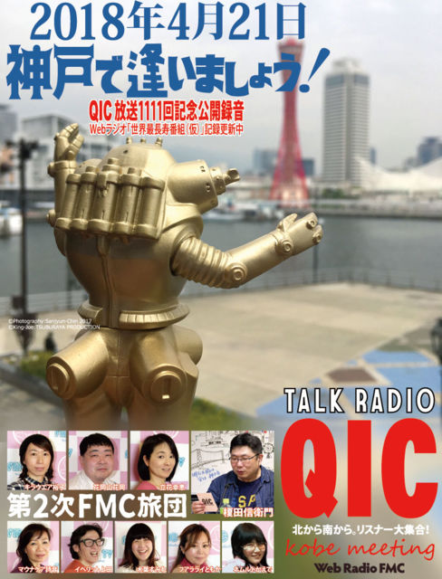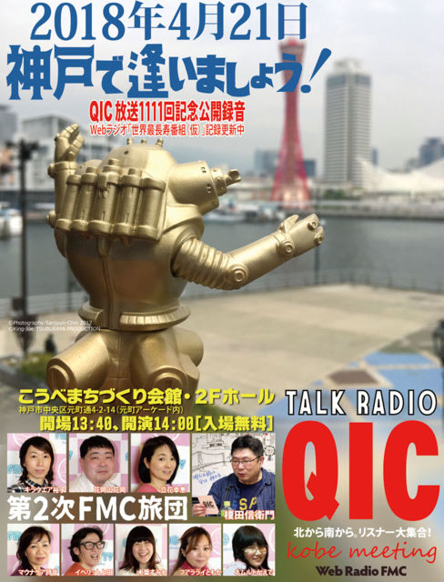世界最長寿(仮)インターネット番組『QIC』放送1111回記念公開録音in神戸。 http://www.fmc.or.jp/qic1111/ 番組でもご案内しておりますように、次のゾロ目&キリ番記念は(次があったとしてw)《1500回※ざっくり10年後》 なので当分やりませんからね! 今回は『第2次FMC旅団』9名参上! すでに北から南から「行くよ!」の声が続々! ありがとうございます!お待ちしています! 日時:2018年4月21日(土)13:30開場、14:00開演 会場:こうべまちづくり会館2Fホール【入場無料】 主催:ウェブラジオFMC 後援:神戸経