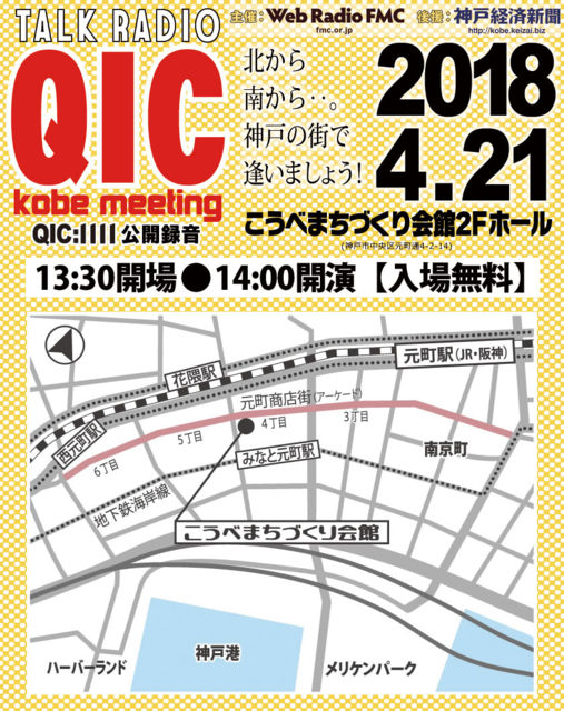 ■熊本地震の際に、被災地の現状を発信し続けた熊本市発インターネットラジオ局FMCがまたまた「神戸」にやって来ます! http://www.fmc.or.jp/ ■FMCのトークラジオ番組『QIC』放送1111回記念公開録音+リスナー交流会 ※QICは、インターネットラジオ世界最長寿番組です! ■会場/こうべまちづくり会館(元町アーケード内)2Fホール ■日時/2018年4月21日(土)開場13:40、開演14:00【入場無料】 ◎公式サイト/http://www.fmc.or.jp/qic1111/ ◎番組サイト/http://www.fmc.or.jp/qic.html