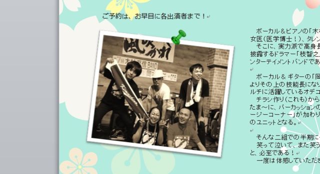 ¡ü³µÍ× £´·î£²£²Æü¡ÊÆü¡Ë Â翹¡§É÷¤Ë¿á¤«¤ì¤Æ http://oomorikazefuka.weebly.com/ Â裹²ó ²¬ËܼçǤvsÌÚ¼»ê¿®£Â£Á£Î£Ä 17:00/18:00 ͽÌó2,000±ß ÅöÆü2,500±ß(+޵ްŽÀŽÞް) ¡ü¥¿¥¤¥à¥¹¥±¥¸¥å¡¼¥ë 18:05¡¡ÌÚ¼»ê¿®BAND 18:40¡¡²¬ËܼçǤ 19:10¡¡µÙ·Æ 19:20¡¡²¬ËܼçǤ 19:55¡¡ÌÚ¼»ê¿®BAND 20:25¡¡Ž±ŽÝŽºŽ°ŽÙ޾ޝ޼ޮŽÝ ¡ü¾Ò²ðʸ ¡¡¥Ü¡¼¥«¥ë¡õ¥Ô¥¢¥Î¤Î¡ÖÌÚ¼»ê¿®¡×¤Ï¡¢¥ß¥å¡¼¥¸¥·¥ã¥ó¤Î¾¡¢¸½Ìò¤Î½÷°å¡Ê°å³ØÇî»Î¡ª¡Ë¡¢¥¿¥ì¥ó¥È¤È¡¢¥Þ¥ë¥Á¤Ë³èÌö¤¹¤ëºÍ½÷¤Ç¤¢¤ë¡£ ¡¡¤½¤³¤Ë¡¢¼ÂÎÏÇɤǹâ¿ÈĹ¤Î¥Ù¡¼¥¹¡Ö±öß·Êݡס£»þ¤Ë¤Ï¥â¥Î¥Þ¥Í¤âÈäϪ¤¹¤ë