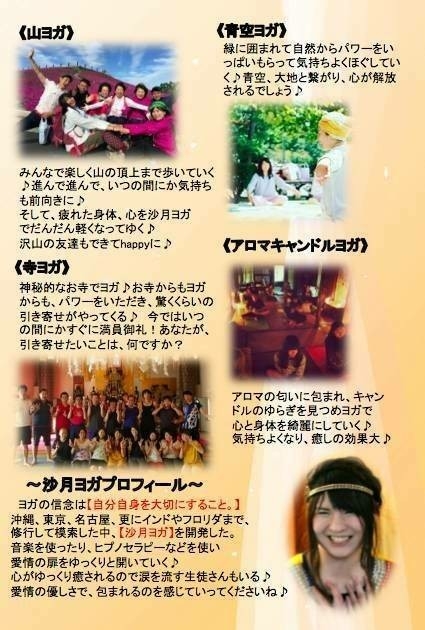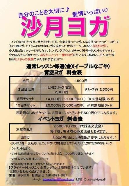 名古屋のハッピーヨガをフリーランスで教えている沙月です。 平日は通常レッスン、土日は寺ヨガ、山ヨガ、青空ヨガ、コラボ等のイベントをしています。 私は、沖縄、東京、生駒で200時間ヨガ修行して、更にインドやフロリダでもヨガトレーニングを積み重ねてきました。 昨年、10月には《名古屋第一人者》クンダリーニヨガ講師資格取得しました。 クンダリーニヨガとは とってもシンプルでパワフル♪ 老若男女誰でもでき、伝統的なヨガでもあります。 アーサナ以外にも呼吸法、そしてマントラなど色々な部分から身体、心を浄化させ現代生活での忙し