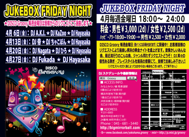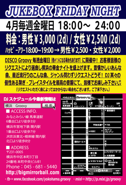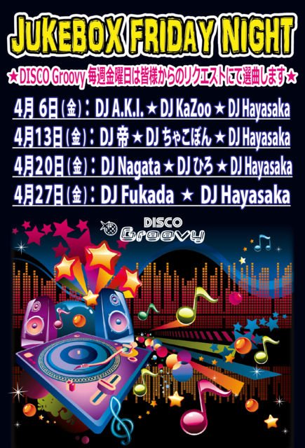 ★お客様からのリクエストにて選曲するイベント:JUKEBOX FRIDAY NIGHT★ 昔懐かしいあんな曲、最近流行りのこんな曲、ジャンル問わずリクエストをどうぞ! DJそれぞれのプレイスタイルを皆様でどうぞお楽しみ下さい♬ 【音楽】オールジャンル(リクエスト優先) Soul、Funk、Dance Classics、HipHop、R&B、EDM、Euro、etc... 【開催時間】 18:00〜24:00 【ハッピーアワー料金 / 18:00〜19:00にご来店の方】 男性:¥2,500 / 2Drinks 女性:¥2,000 / 2Drinks 【料金 / 19:00以降ご来店の方】 男性:¥3,000 / 2Drinks 女