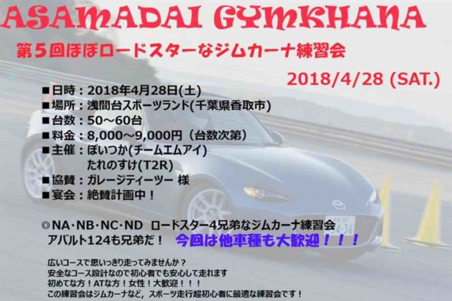 (先につぶやきにて書き込ませて頂きました内容とほぼ同じです。) スポーツ走行に興味ありませんか? 初心者大歓迎なジムカーナ練習会のお知らせです。 現在(4月1日)でまだ10台ほど枠があります。 "ロードスターな"とは言っていますが、兄弟車だろうが、ATだろうが、車種に関係なく参加OKです。 全日本ジムカーナに出場していらっしゃいます選手2名による指導も、費用そのままで受けられます。 (ジムカーナ地区戦に出場しております選手によるバトルもあるかも?) 日程:2018年4月28日(土) 場所:浅間台スポーツランド(千葉県香取市) 参加費: