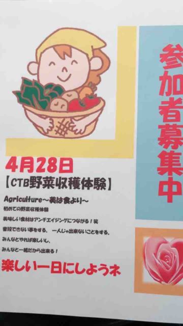 ◆CTBニュース!◆ お待たせいたしましたっ!!(^^♪ 春野菜の収穫祭、日程が決まりました。 ●日程 4月28日 土曜日 昼間 ●場所 千葉某所 《内容ご紹介》 ●土に触れ、無農薬野菜の収穫体験が出来ます。 (以前の参加メンバーの中には姿格好が現地農家の方と見間違える程本格的な方も居て、笑った笑った〜。) ●お土産の野菜もありお野菜高騰のこの時期には助かるのよね〜と。 ●収穫体験の後は取れたて野菜を使ってBBQランチです。 事前仕込み済のお肉、海産物、も一緒に美味しいBBQをご用意いたします