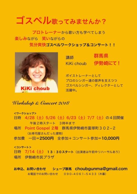 管理人様、いつもお世話になります。 貴重な告知の場をありがとうございます。 ご興味ありましたら、お気軽にお問合せください。 群馬で、いよいよ今月からワークショップスタートです。 ボイストレーナーの KiKi choub を迎えてのゴスペルワークショップ 第1回目。 7月14日(土)のゴスペルコンサートで歌う曲を練習します。コンサートで、KiKi choub のゴスペルクワイアとステージで一緒に歌います! 新規ゴスペルクワイア立ち上げイベントです♪ 初心者大歓迎!1回だけの参加もOK! 群馬の皆様、お誘いあわせの上、 ぜひ応援にお