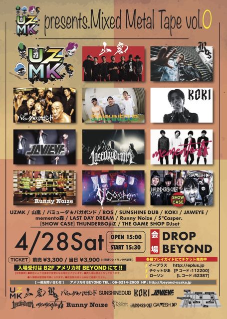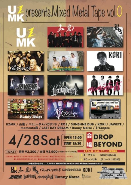 アメリカ村 DROPの真下にアメリカ村 BEYONDがオープン! オープンを祝してUZMK主催の貫通イベント [ Mixed Metal Tape vol.0 ] に出演決定!! [ Mixed Metal Tape vol.0 ] UZMK presents 2018.04.28.sat at:アメリカ村 DROP / アメリカ村 BEYOND open/15:00 start/15:30 adv/door \3,900 (+1drink \600) ※就学児童チケット代必要 / 3歳以上同伴者付き添いの上ドリンク代のみ必要 出演 ■UZMK ■⼭嵐 ■バミューダ★バガボンド ■ROS ■SUNSHNE DUB ■KOKI ■JAWEYE ■memento森 ■LAST DAY ■DREAM ■Runny Noize ■$"