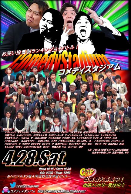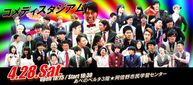 「第207回 コメディスタジアム(コメスタ)」 http://comedystadium.jimdo.com/ 4月28日土曜日 開場18:15/開演18:30 あべのベルタ3階★阿倍野市民学習センター (「Q’sモール」横の建物となっております。) 前売りチケット予約はコチラから http://comedystadium.jimdo.com/ since1999の歴史あるお笑いライブ「コメディスタジアム」、通称「コメスタ」! 芸人育成ライブとして位置付けのお笑いライブ。 「レギュラー組・2分組・1分組」の3段階層による