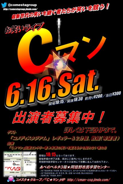 Âè111²ó £Ã¡ú¥Þ¥ó ¡¡¡¡http://cman-csg.jimdo.com/ ¡¡¡¡£µ·î£±£²ÆüÅÚÍËÆü ¡¡¡¡³«¾ì18¡§15¡¿³«±é18¡§30 ¡¡¡¡¤¢¤Ù¤Î¥Ù¥ë¥¿£³³¬¡ú°¤ÇÜÌî»Ô̱³Ø½¬¥»¥ó¥¿¡¼ Á°Çä¤ê¥Á¥±¥Ã¥ÈͽÌó ¡¡¡¡http://cman-csg.jimdo.com/ Ëè·î¡¢°¤ÇÜÌî¤Ç³«ºÅ¤µ¤ì¤Æ¤¤¤ë¡Ö¥³¥á¥Ç¥£¥¹¥¿¥¸¥¢¥à¡×¾º³Ê¸¢¤ò¤«¤±¡¢¥é¥ó¥¥ó¥°¥Í¥¿¥Ð¥È¥ë¤¬·«¤ê¹¤²¤é¤ì¤Æ¤¤¤ë¡ª ¤³¤ì¤Þ¤Ç¤Î½Ð±é¼Ô http://csg-performer-data.jimdo.com/ ¾×·â¡¡Ì¤Íè¤Î¾Ð¤¤¤òÊѤ¨¤ë¤«¤âÃΤì¤Ê¤¤¼Ô¤¿¤Á¤¬¥Í¥¿¤ò¶¥¤¦¡ª ¥²¥¹¥È ¡¡¾®À¤ó¤»¤ó ¡¡¥¶