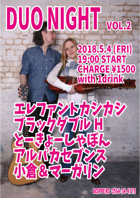 DUO NIGHT vol.2 2018.5.4 (FRI) 19:00 START CHARGE \1500 with 1drink エレファントカシカシ ブラックダブルH とーきょーしゃぼん アルパカセブンス 小倉&マーガリン