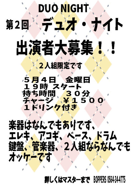 第2回 デュオ・ナイト 出演者大募集! 二人組み限定 2018年5月4日 金曜日 19:00 スタート 持ち時間30分 チャージ ¥1500 1ドリンク付き 楽器はなんでもありです、 アコギ、エレキ、キーボード、 ベース、ドラム、管楽器、 などなど 2人組ならなんでもオッケーです 詳しくはマスターーまで