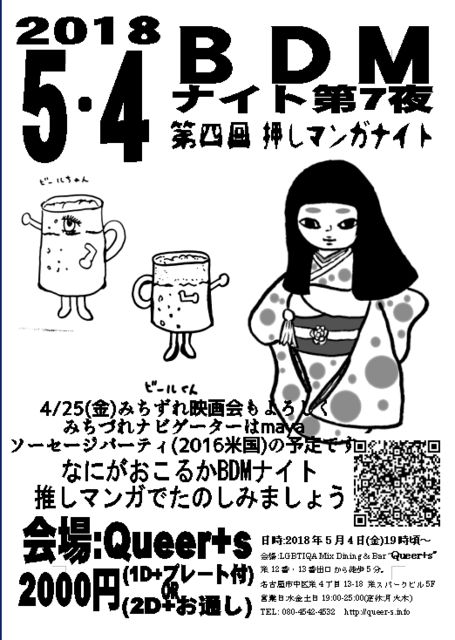 【5/4(金)】BDMナイト第七夜・第四回押しマンガナイト BDM押しマンガナイト なにがおこるかBDMナイト。 好評のため七夜開催です。 なにをするのか、誰が来るのかなど、聞くのは野暮というものです。 お越しください。 推しマンガ大会を継続開催予定です。 みなさんの推しマンガをお持ちください。 ゲームもあるかもです。 5/4(金)19時頃〜 2000円(1D+ブレートor2D+お通し) 4/28(土)みちづれ映画会もよろしく 次回のみちづれナビゲーターはmaya フリークスの予定です。 LGBTIQA Mix Dining & Bar Queer+s 名古屋市中区栄4丁